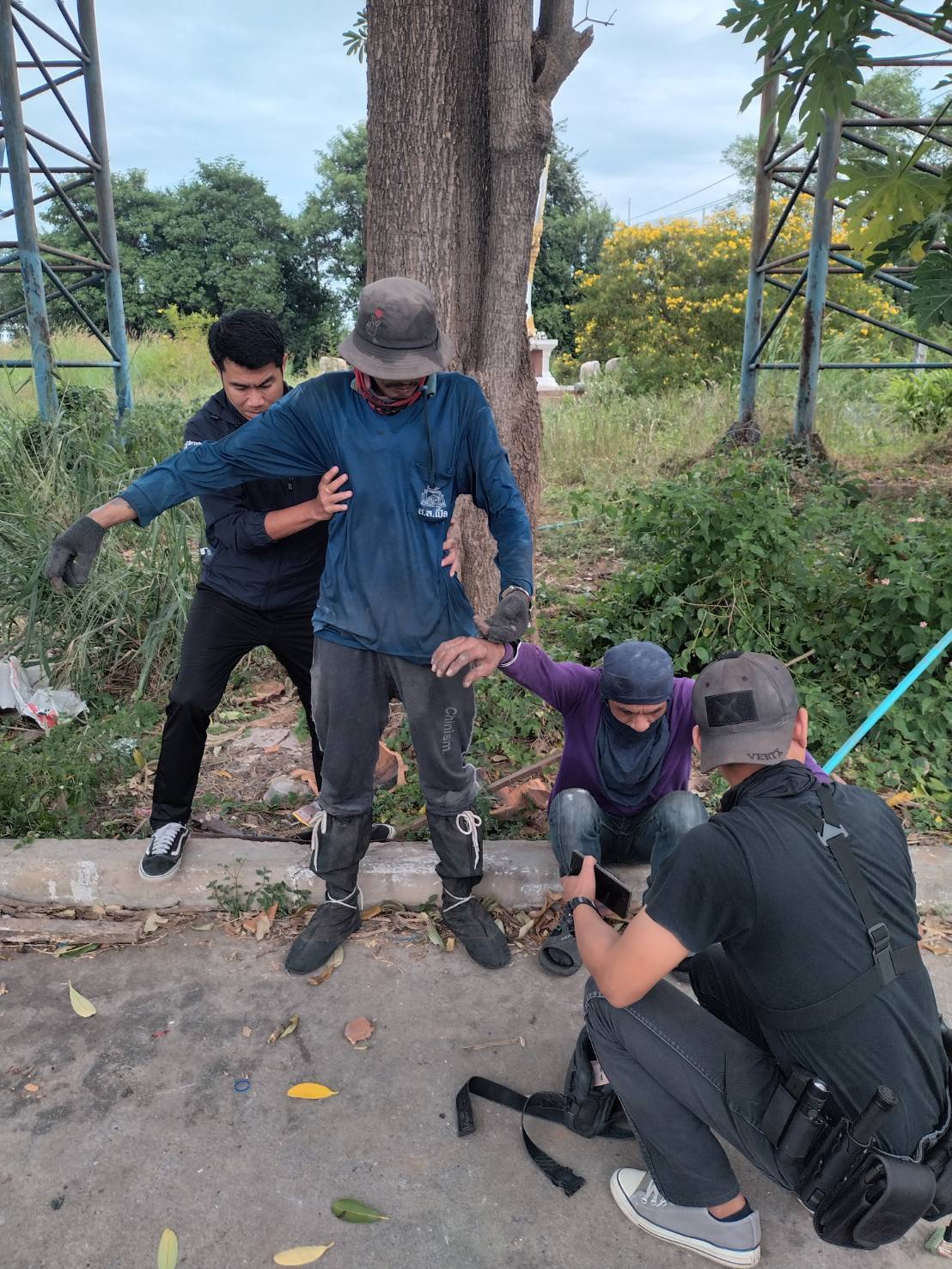 เจ้าหน้าที่เข้าจับกุมตัวผู้กระทำผิด 5 ราย (ชาย 4 ราย หญิง 1 ราย) จากการตรวจสอบสถานที่พบมีจุดมั่วสุมเสพยาเสพติดพร้อมอุปกรณ์การเสพ ชิ้นส่วนเหล็กโครงสร้างอาคารตัดแล้วพร้อมขนย้ายหนักประมาณ 200 กิโลกรัม อุปกรณ์ตัดเหล็กแบบแก็ส 2 ชุด รถกระบะ 2 คัน รถจักรยานยนต์ 3 คัน รถจักรยานยนต์พ่วงข้าง 1 คัน รถไส 2 คันเจ้าหน้าที่ทำการตรวจยึดของกลางจากการกระทำผิดนำไปตรวจสอบที่สภ.พรหมบุรี และส่งตัวผู้ต้องหา 5 รายแก่พนักงานสอบสวนเพื่อดำเนินคดี และ ออกหมายเรียกผู้หลบหนีต่อไป