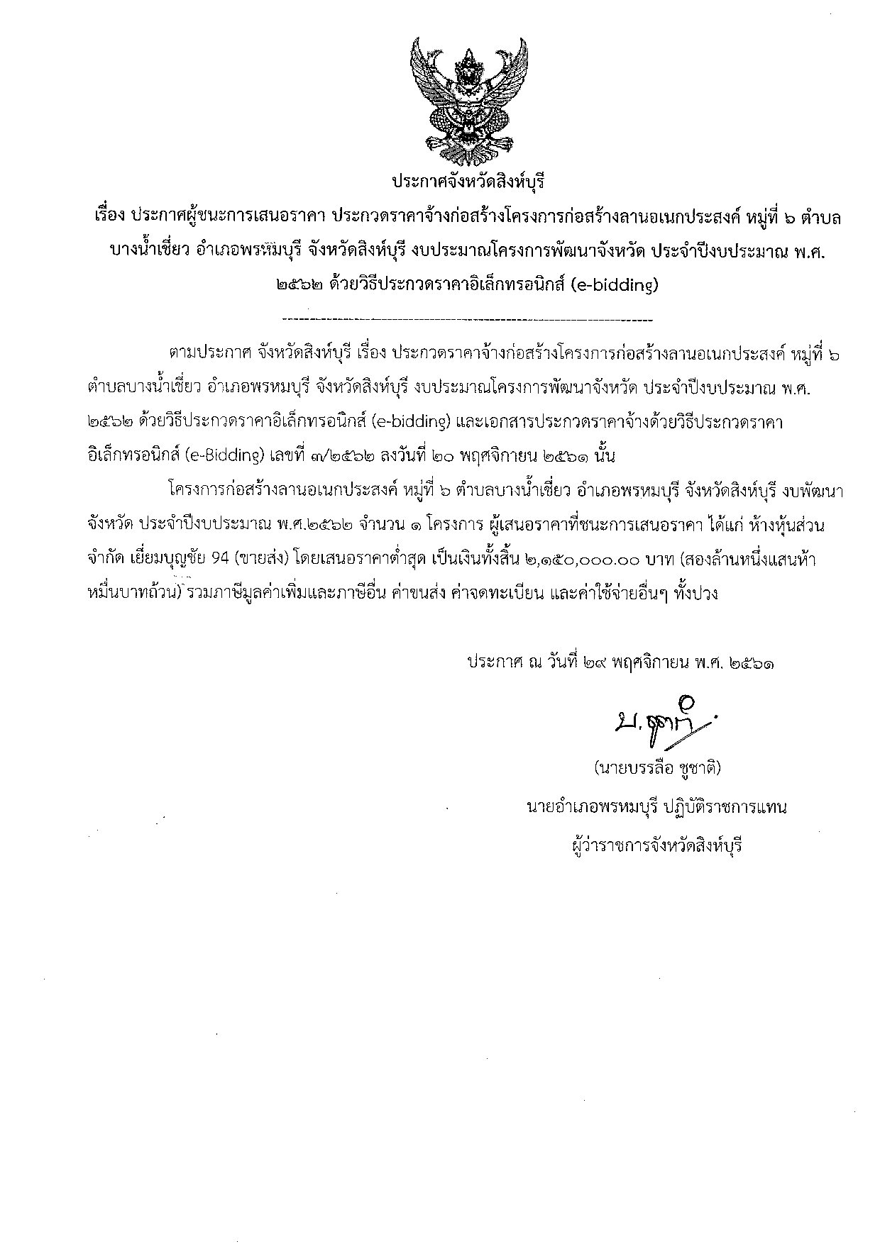 ประกาศจังหวัดสิงห์บุรี เรื่อง ประกาศผู้ชนะเสนอราคา ประกวดราคาจ้างก่อสร้างถนนคอนกรีตเสริมเหล็ก บ้านกระทุ่มโพรง หมู่ที่ 6 ตำบลพระงาม อำเภอพรหมบุรี ด้วยวิธีประกวดราคาอิเล็กทรอนิกส์ (e-bidding)