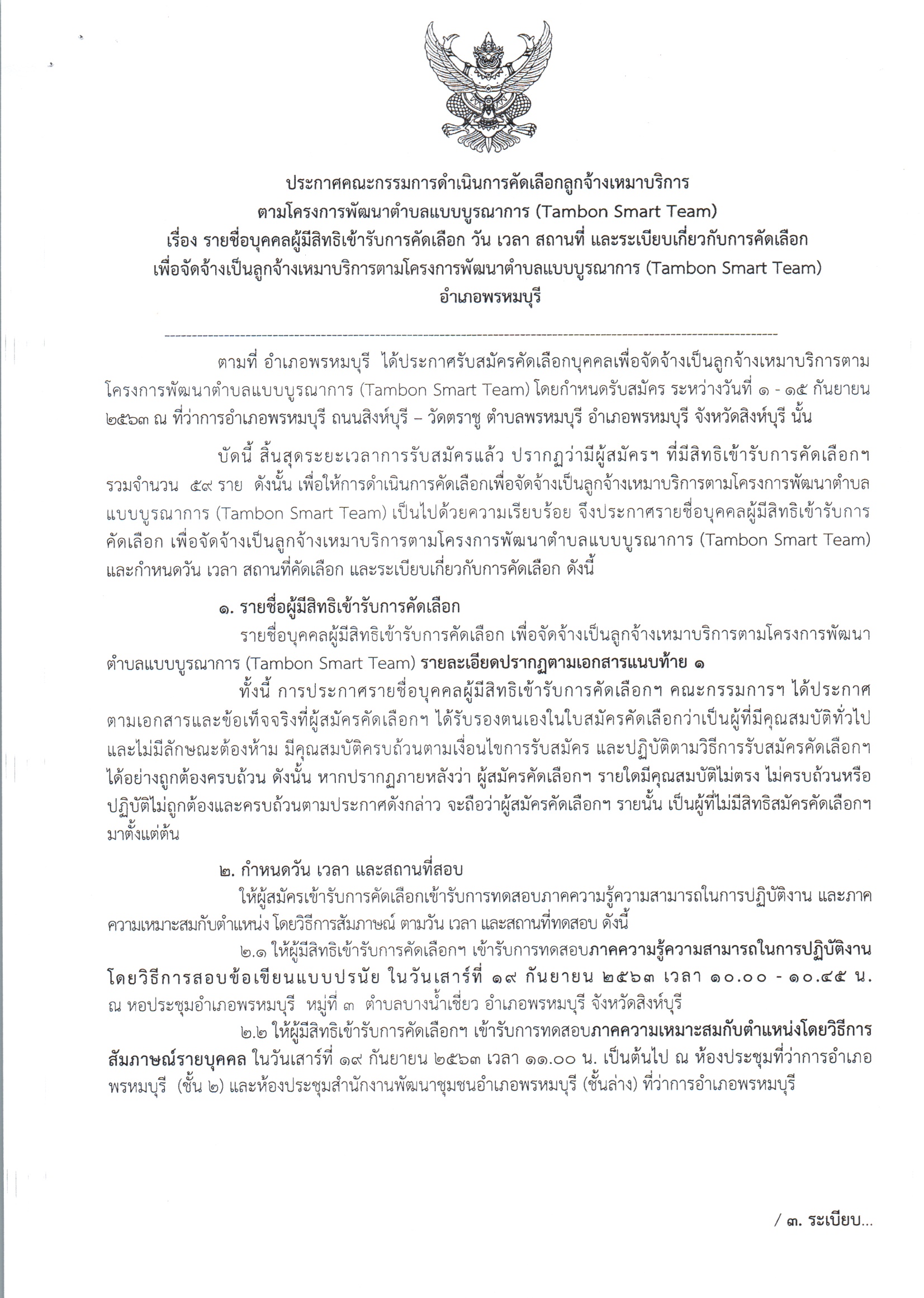 ประกาศอำเภอพรหมบุรี เรื่อง รายชื่อบุุคคลผู้ได้รับการคัดเลือกเพื่อจัดจ้างเป็นลูกจ้างเหมาบริการ ตามโครงการพัฒนาตำบลแบบบูรณาการ (Tambon Smart Team ) อำเภอพรหมบุรี